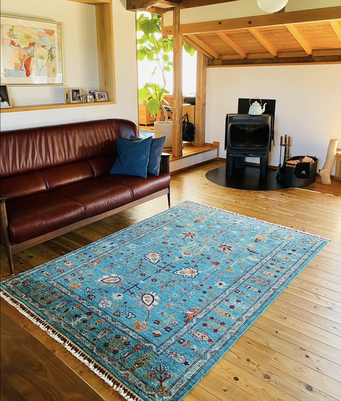 ターコイズ色のガズニン。手織りの絨毯の中では珍しく希少な色です。現地でもそう多くはないターコイズ。その透明感ある特別な色は、藍色にも近しく、日本人の感覚感性と繋がって、自然と暮らしに馴染んで行きます。
