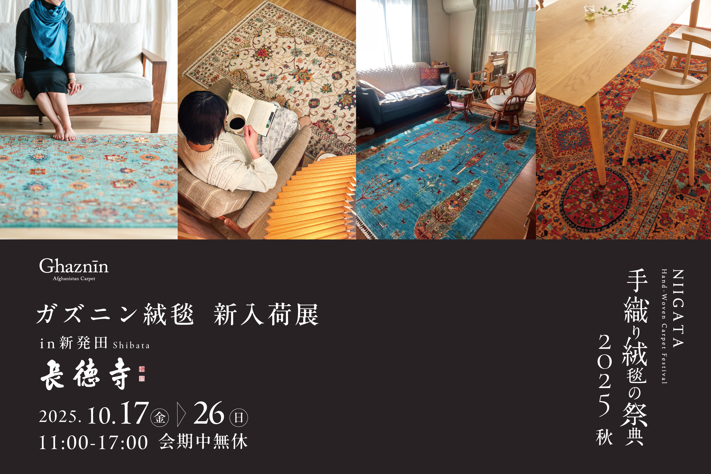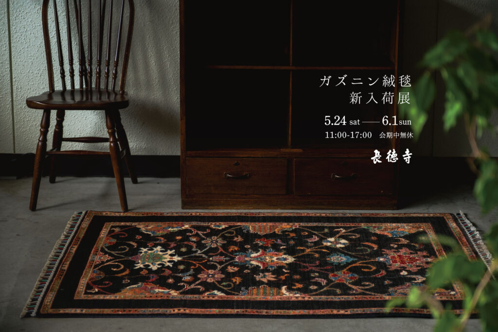 絨毯をお探しの方も、そうでない方も、どうぞ最後までご覧いただけると嬉しいです。毎回好評をいただいております絨毯展ですが、今回はアフガニスタンから届いた「Ghaznin絨毯-ガズニン-」の新入荷展を中心に、「厳選ペルシャ絨毯展」も開催いたします。他にも新入荷直前の「Maymana(マイマナ)刺繍キリム」の事前予約、「GOSHIMA絨毯・家族の絨毯アーモンド」のオーダー相談会も同時開催いたします。